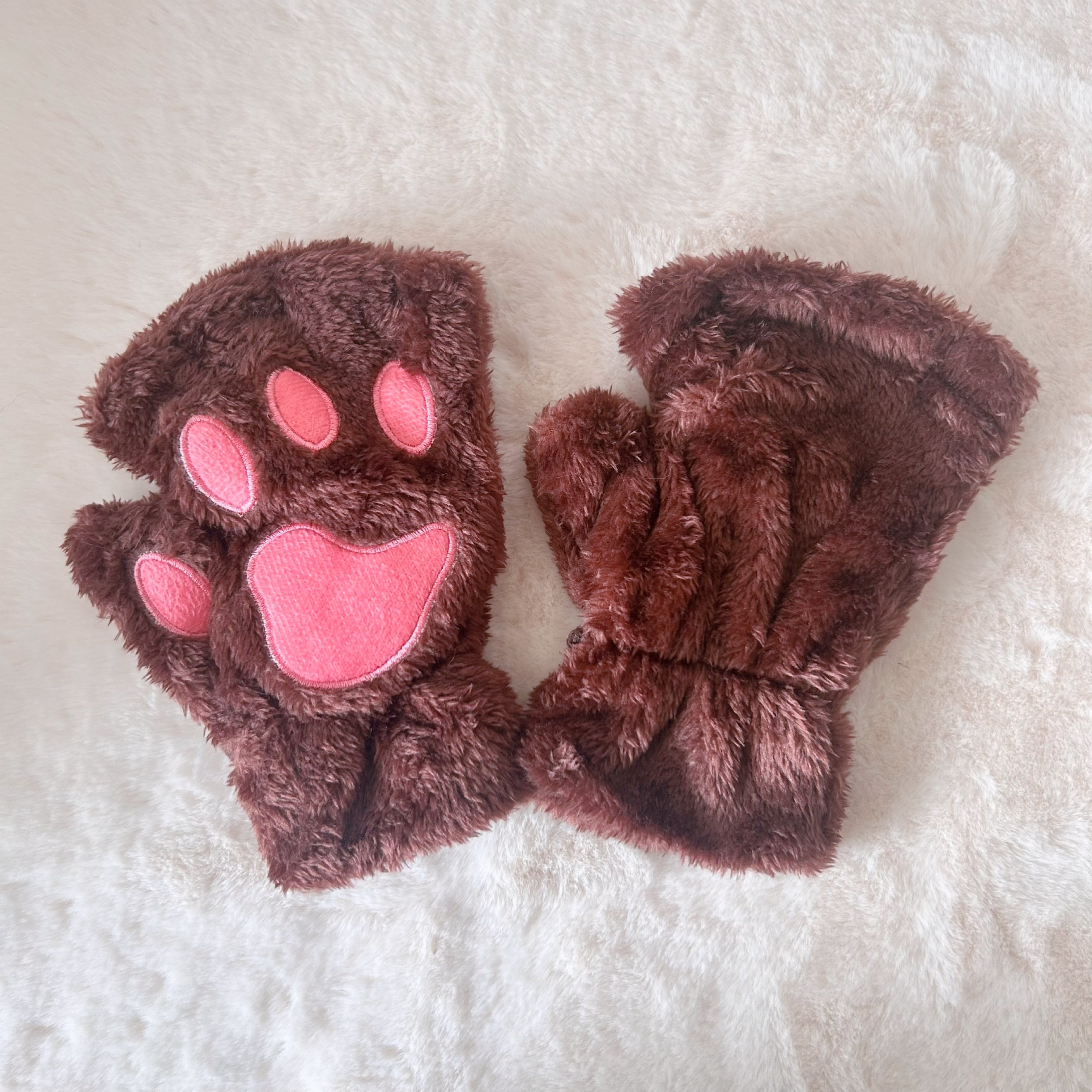 濃い目の茶色で、肉球のデザインが際立ちます。ハーフフィンガー仕様なので、指先を自由に使えるため、スマートフォンやタブレットの操作も楽々です。